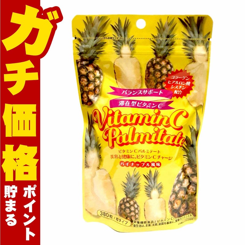 バランスサポートビタミンCパルミテートは、ご家族の皆様で美味しく召し上がっていただけるパイナップル風味のビタミンC粒です。