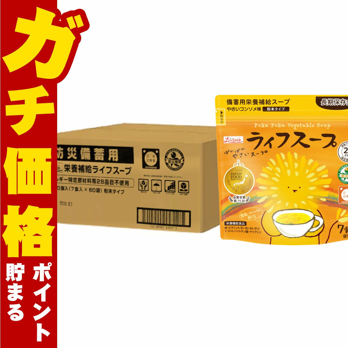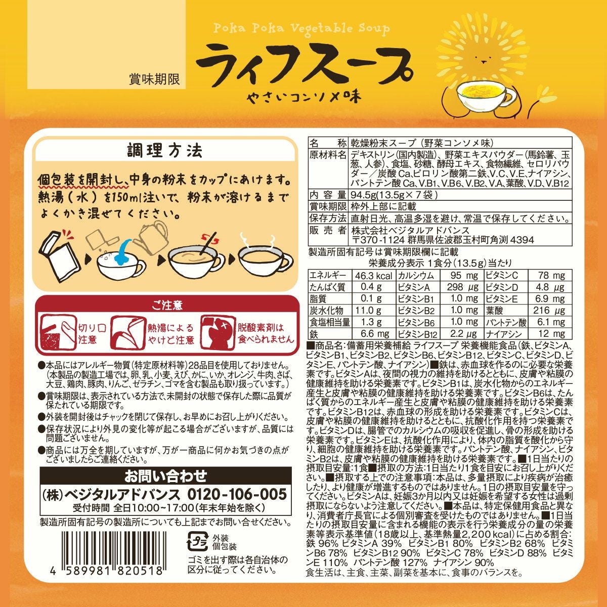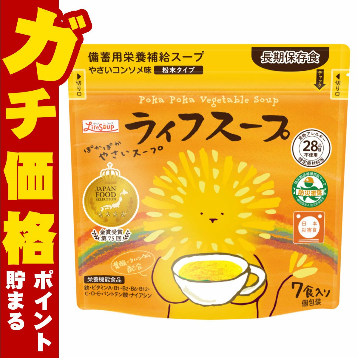 【クーポン配布中】 備蓄用栄養補給 ライフスープ 野菜コンソメ (13.5g×7包)【ベジタルアドバンス 栄養機能食品】【乾燥スープ 備蓄用栄養補給 長期保存食 防災推薦 日本災害食 7食入り 個包装 やさいコンソメ味 ぽかぽかやさいスープ】【メール便対応商品】【SBT】(6056265)