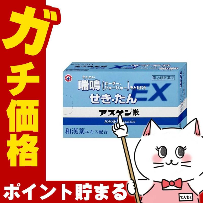 和漢薬エキスを中心とした5種類の配合成分の働きで、せき・たんの症状を穏やかに鎮めます。主成分のマオウエキスとジプロフィリンの配合は、気管支拡張作用が相乗的となり、喘鳴(ぜーぜー、ひゅーひゅー)をともなうせきの症状に効果的です。(アスゲン散のリニューアル品です。)