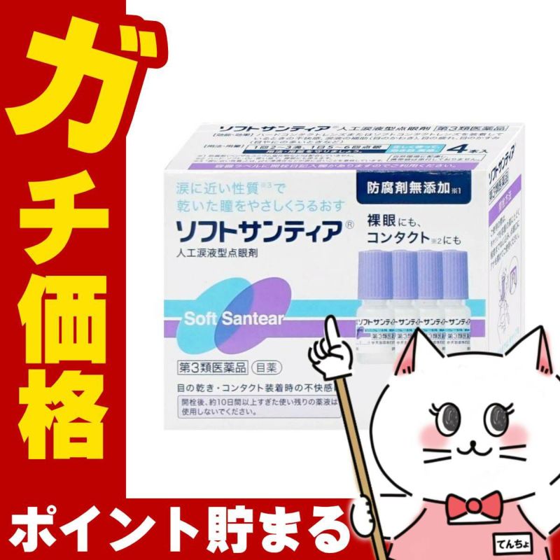 数字が大きくなるほど強い爽やかなさし心地、小さいほど目にしみない・やさしいさし心地となります。ソフトサンティアは涙液に近い性質を持った人工涙液で、涙液不足に伴う目のかわき・異物感などの不快な症状を改善します。また、ソフトサンティアは、コンタクトレンズに対して何ら影響を及ぼさないことが確かめられていますので、すべてのタイプのコンタクトレンズ[ソフト・O2・ハード・ディスポーザブル(使い捨て)]を装着したまま点眼することができ、コンタクトレンズ装用時の不快感、目の疲れ、目のかすみ、目のかわきなどの諸症状を改善します。