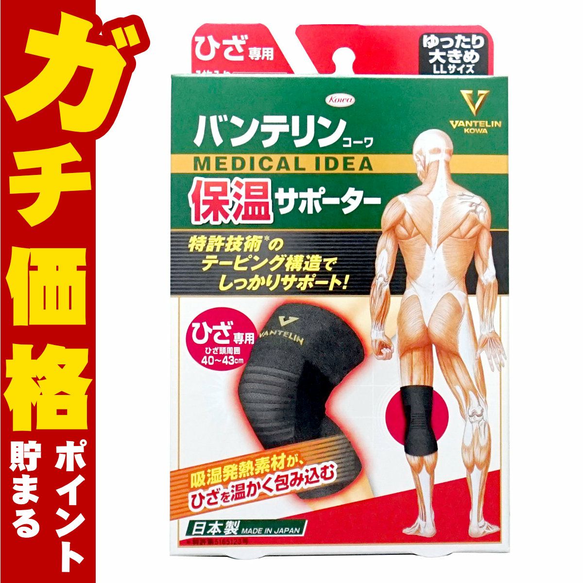 コーワ バンテリン 保温サポーターひざ用 ブラックLL(ゆったり大きめ)※ひざ頭周囲40~43cm【バンテリン膝サポーター 日本製 Kowa 興和】【メール便対応商品】【SBT】(6045645)
