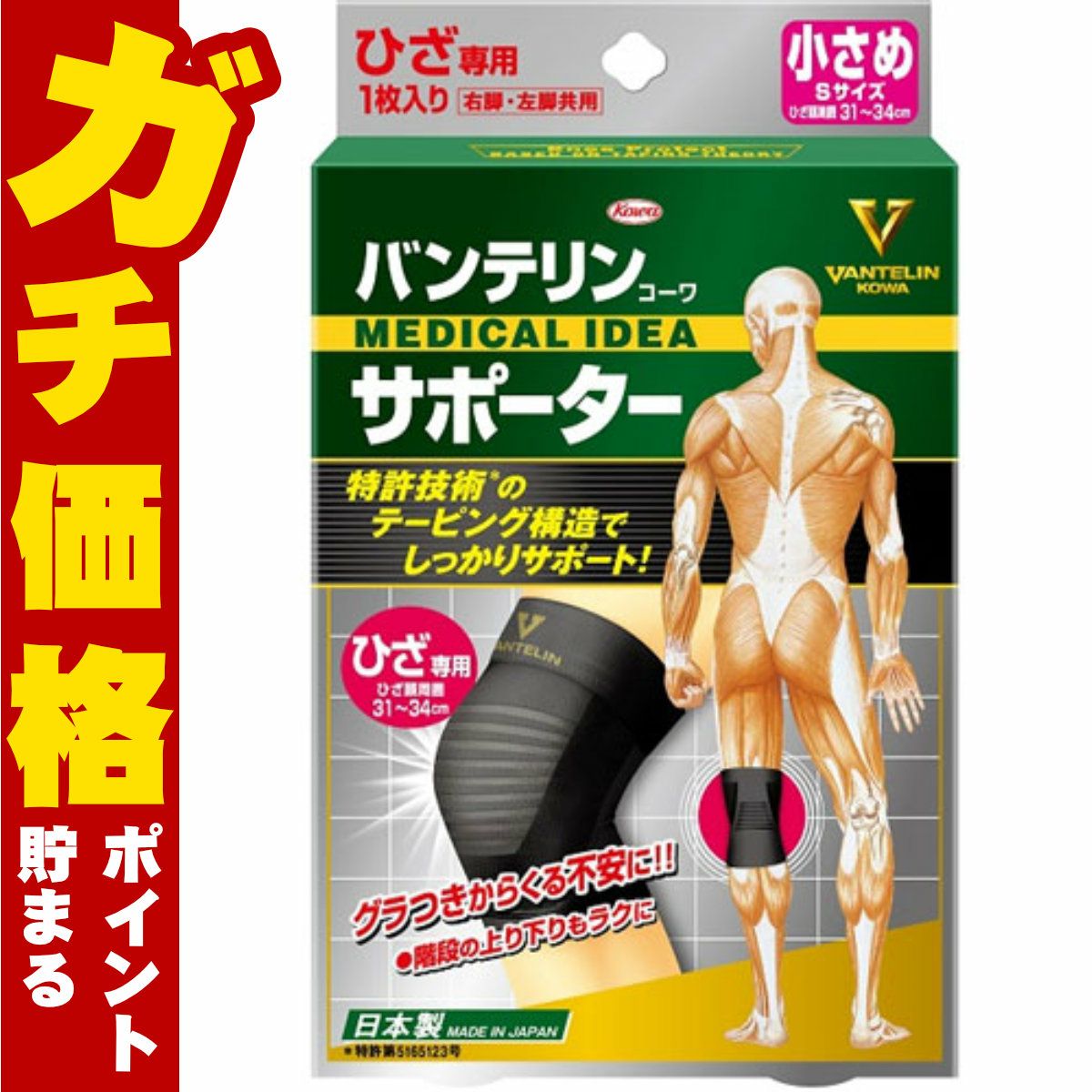 コーワ バンテリンサポーターひざ用 ブラックS(小さめ)※ひざ頭周囲31-34cm【膝サポーター/膝専用/左右共用1枚入り】【日本製/ Kowa / 興和】【メール便対応商品】【SBT】(6018324)